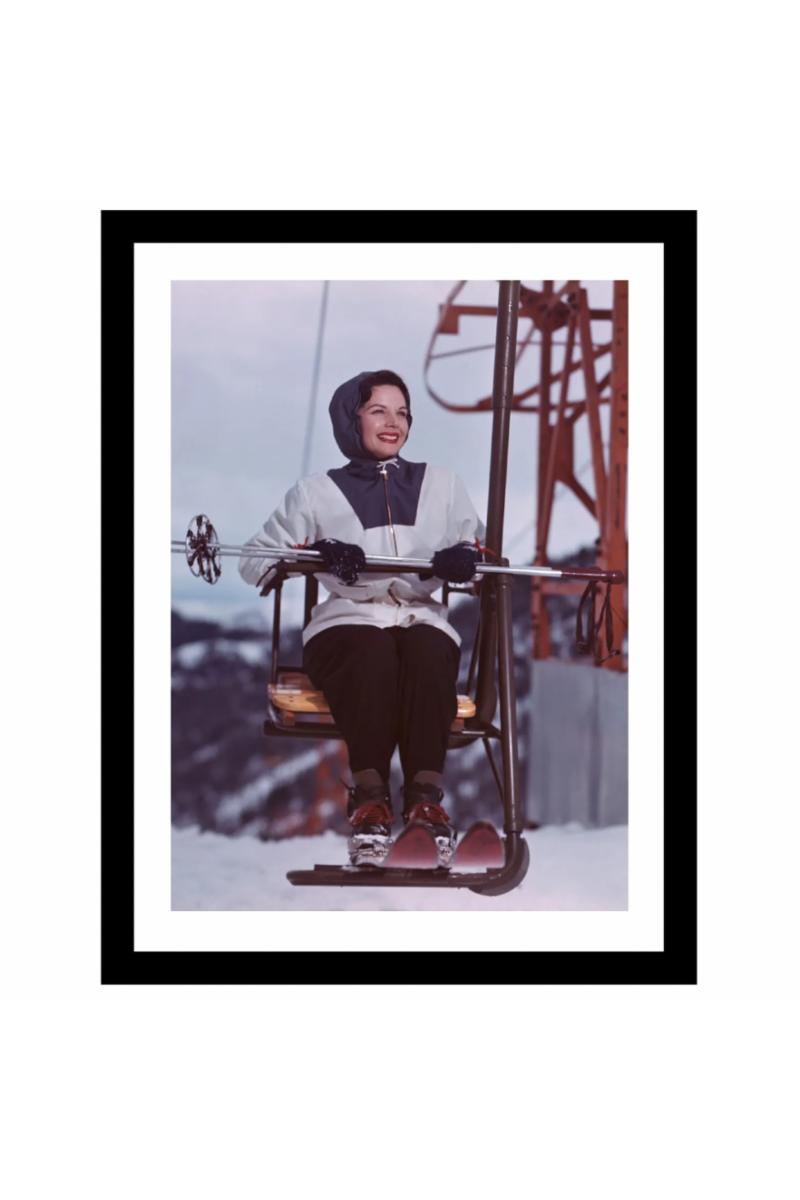 Glass picture w/frame woman takes ski chair lift 70cm x 90cm