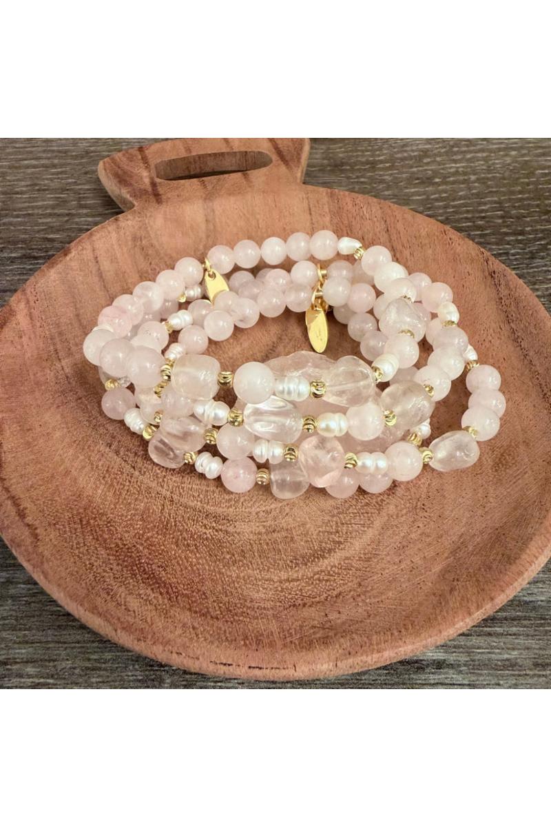 NOK 499.00 Dette vakre armbåndet, Harmoni, er satt sammen av rosenkvarts, ferskvannsperler og 18k gullforgylte detaljer. Den duse rosafargen i rosenkvarts gir et mykt uttrykk, og krystallen forbindes med kjærlighet, omsorg og selvverd. Ferskvannsperlen forbindes med et rolig nærvær og kan være en påminnelse om å åpne for det feminine – mykhet og styrke side om side. Availability: Only 3 left in stock!