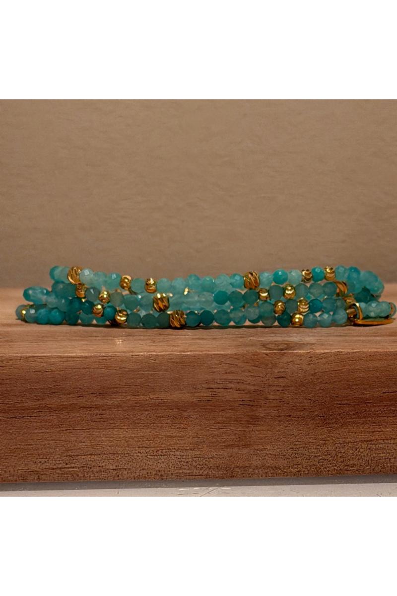 NOK 499.00 Sanselig nærvær er et petite armbånd av vakker, fasettert turkis amasonitt og små gullperler. Amasonitt forbindes med mildhet, balanse og klarhet. De turkise fargenyansene er klare i fargen og inviterer til oppmerksom tilstedeværelse – til å kjenne etter, være nær det som skjer, og legge merke til det rundt oss. Amasonitt er også forbundet med å dempe uro og stress, og bidra til et mer samlet fokus i hverdagen. Den inviterer til å puste litt dypere og ta ting i et roligere tempo. Availability: Only 3 left in stock!