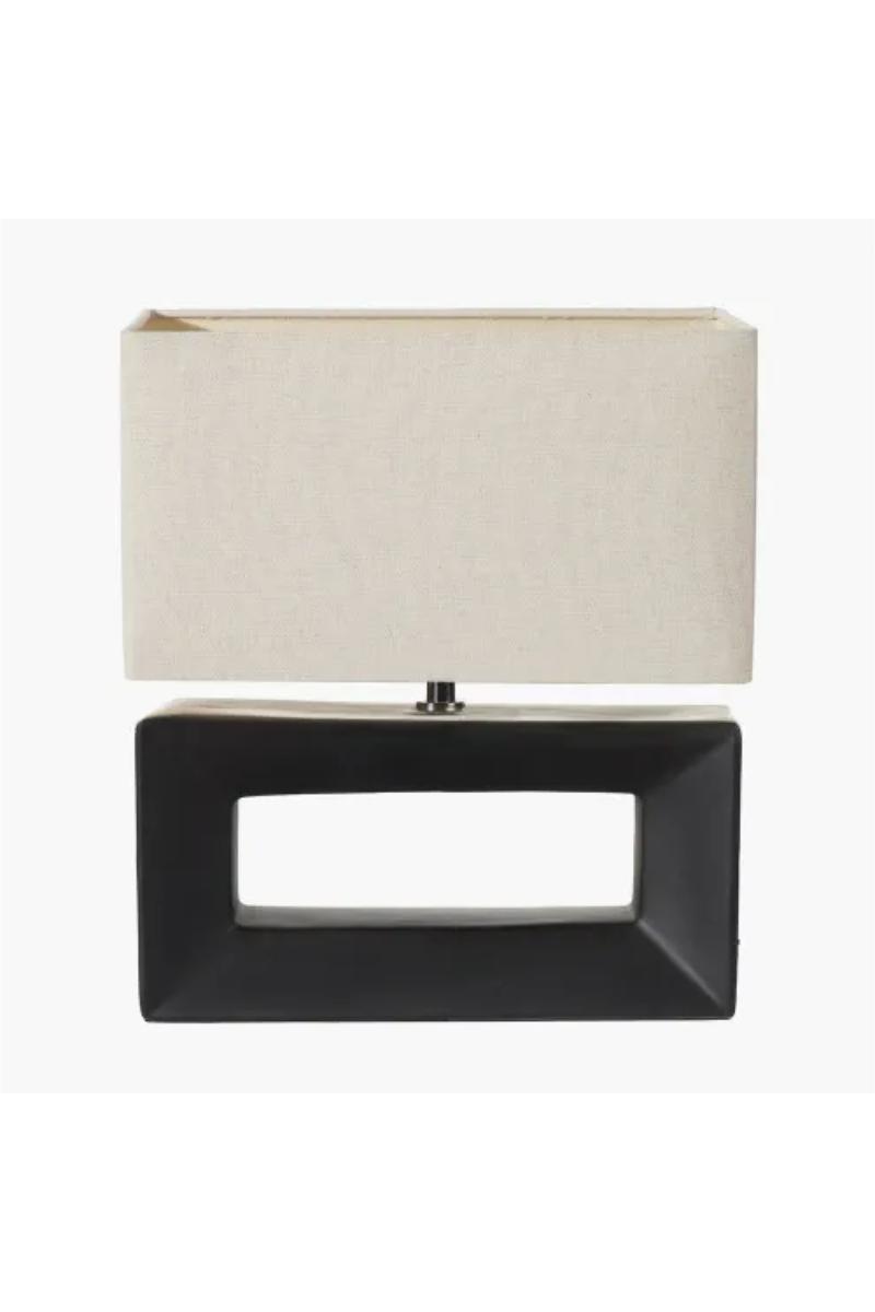 Rektangulær bordlampe i keramikk - sort. Lampen leveres komplett med lys rektangulær skjerm.