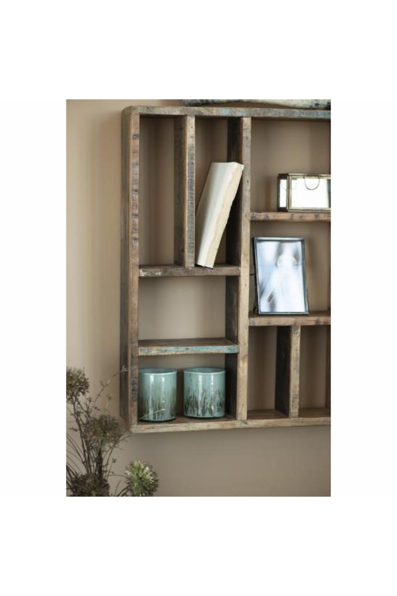 Vis hvem du er. Vegghyllen laget av resirkulert indisk tre, som stammer fra nedbrytende materialer. Det vil være knuter, sprekker, sprekker og splinter i treverket, og treslaget vil variere. Hyllen kan henges horisontalt og vertikalt. Den vakre vegghyllen er laget av gjenvunnet indisk treverk og kommer med livet treet har levd før det ble resirkulert til en vegghylle for deg. 11 lunefulle, små rom som vender mot alle retninger kan inneholde det du bryr deg om. Det litt mørkere treverket er et uttrykk for en ny trend, kolonistilen, som er på vei inn i våre hjem igjen. Det blir litt mørkere, litt varmere, litt mer naturlig – og her ser du et eksempel hvor hyllen, som allerede har mye sjel fra starten av, kan brukes hjemme hos deg for å vise frem de tingene du bryr deg mest om . Bilder, reiseminner, småting barna har laget. Alt som er deg.