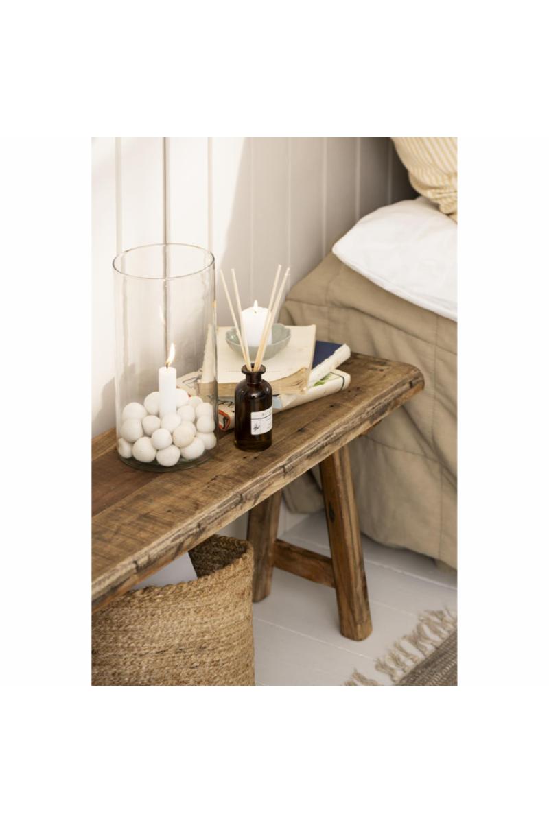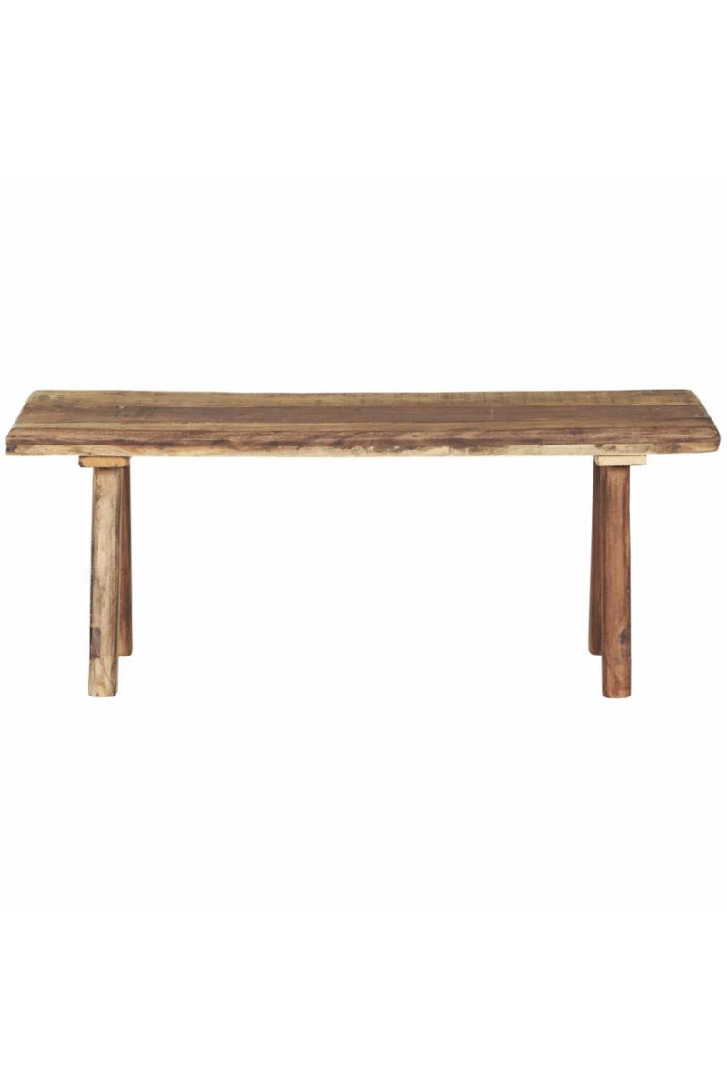 Benken er laget i India av resirkulert rivetømmer, noe som gjør hver benk unik i form og farge.