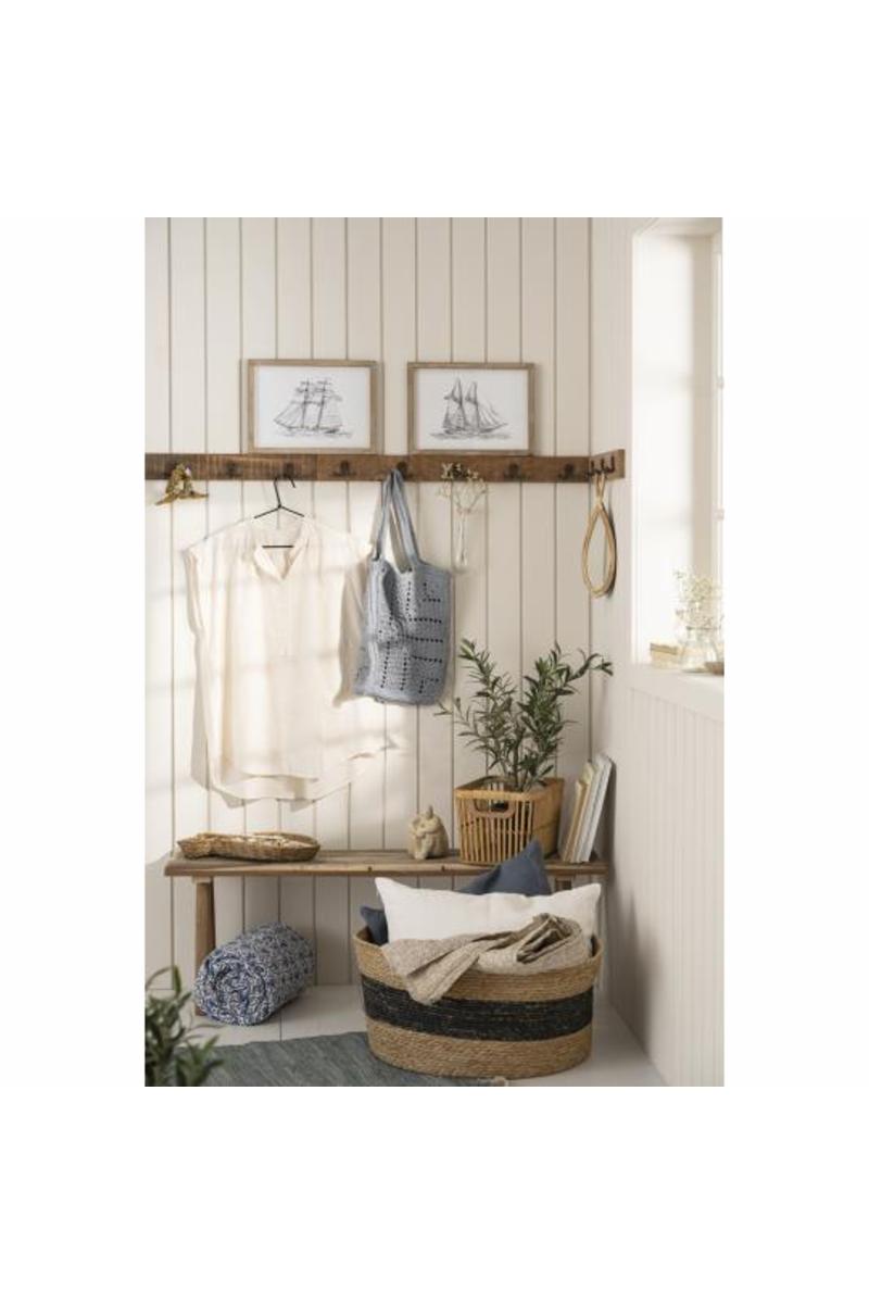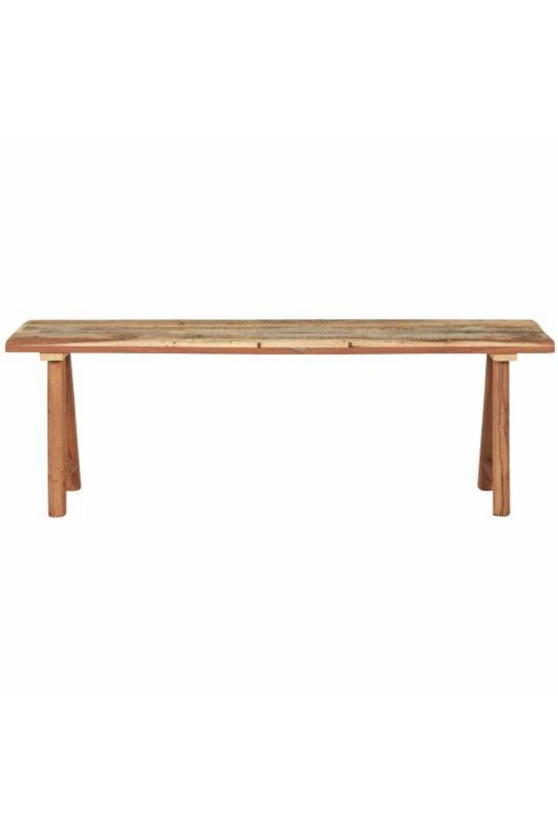 Benken er laget i India av resirkulert rivetømmer, noe som gjør hver benk unik i form og farge.