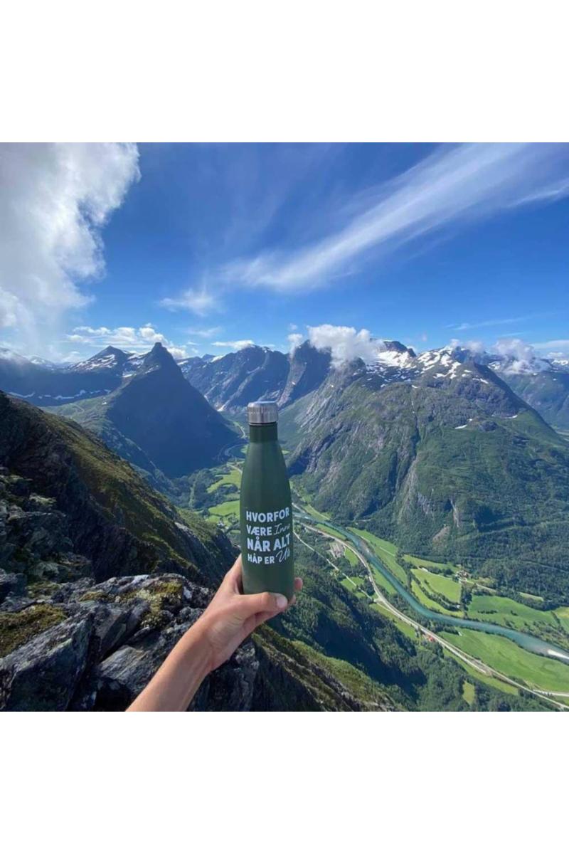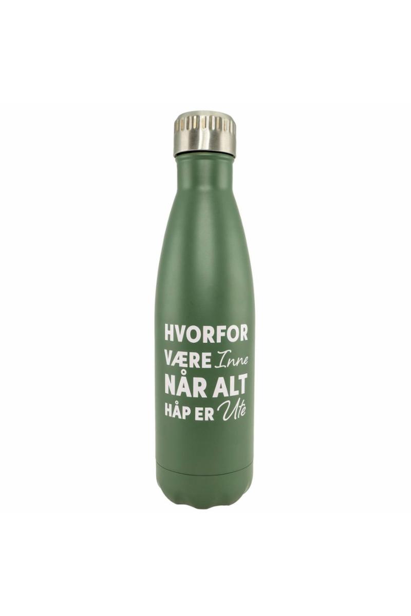 Flasken har doble isolerende vegger, slik at den holder godt på temperaturen på innholdet i flere timer, om det nå er isende kaldt eller kokende varmt. Dette gjør flasken til en ideell følgesvenn på varme dager på stranda (med iskald drikke), eller til matpausen på fjellturen (med varmt vann til kaffen)! Termoflasken passer fint i sidelomma på sekken. Den morsomme teksten «Hvorfor være inne når alt håp er ute» oppfordrer til uteaktivitet og friluftsliv, og passer godt for aktive folk.