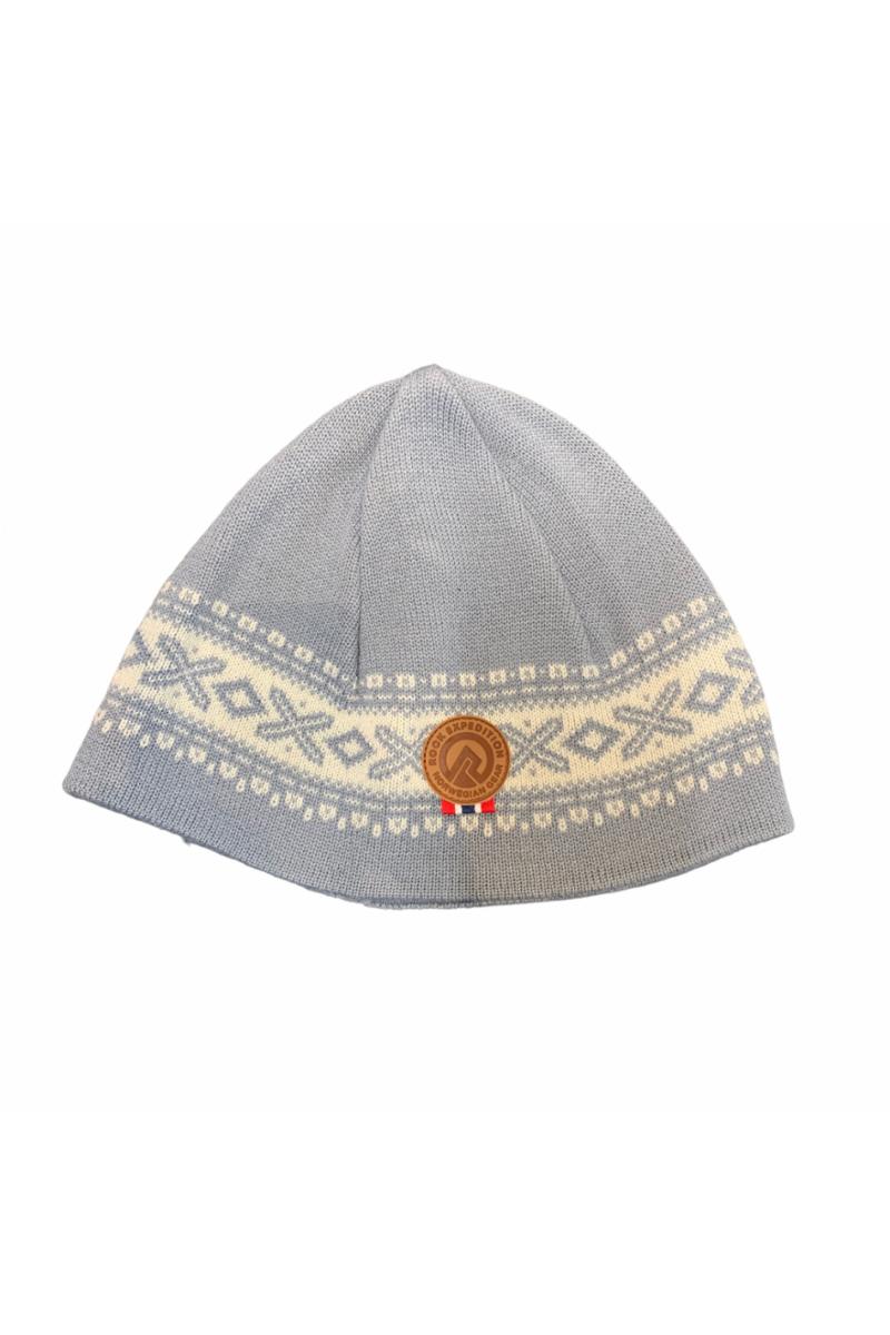 Strikkelue 100% ulllyseblå/hvit