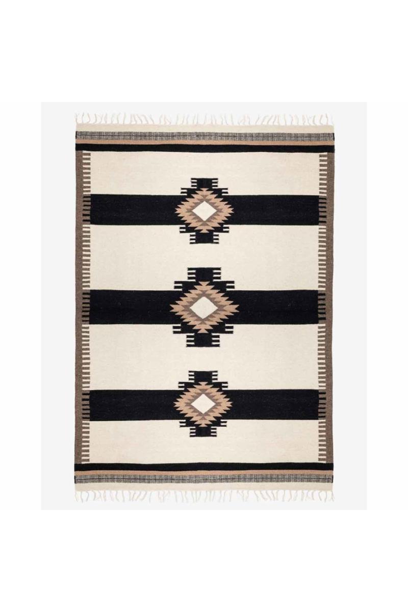 Gulvteppe av ull med kelim-mønster i naturhvit, beige/brun og svart. Designet av Halvor Bakke.