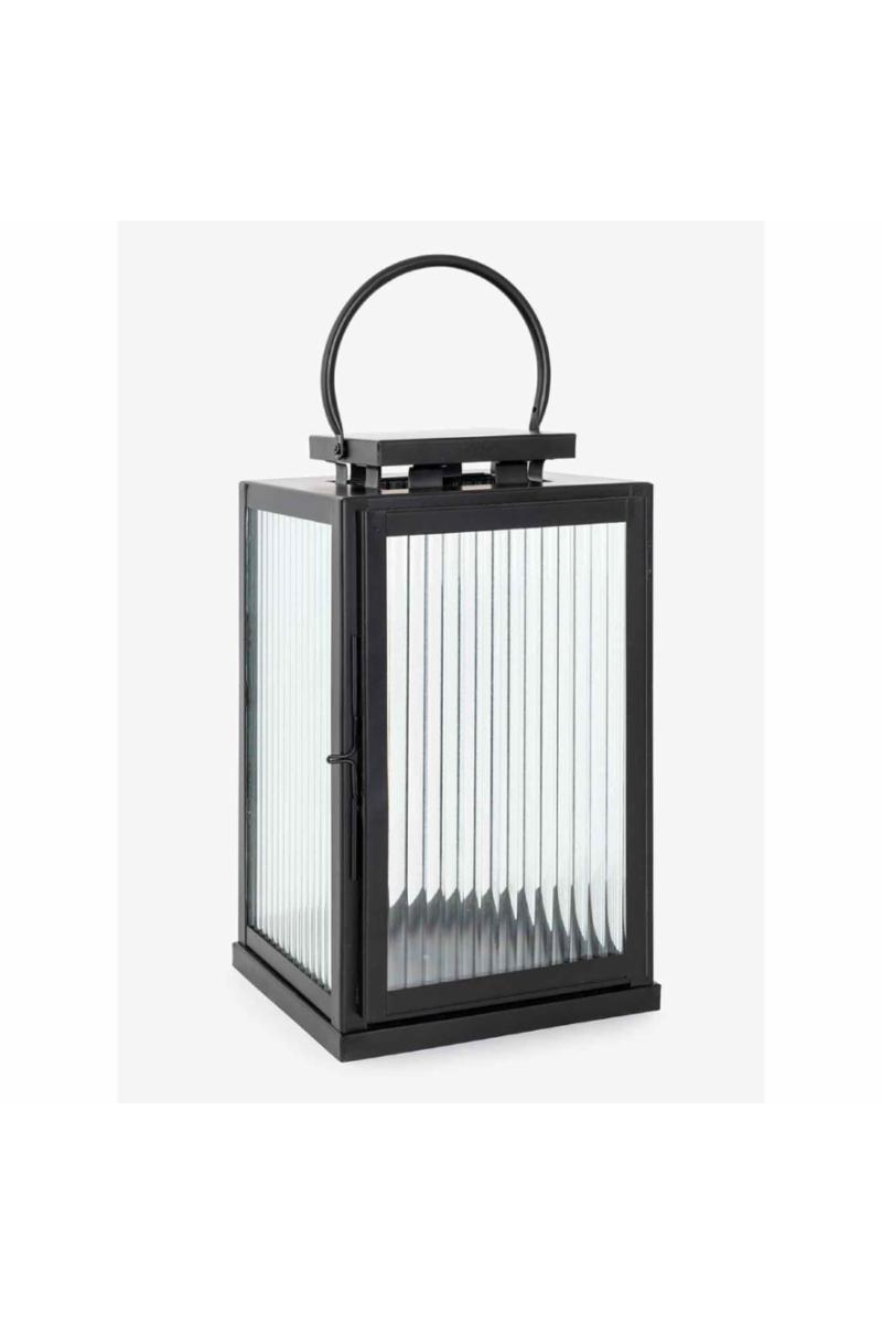 Sort lanterne i lakkert rustfritt stål med rilleglass-panel, designet av Halvor Bakke.
