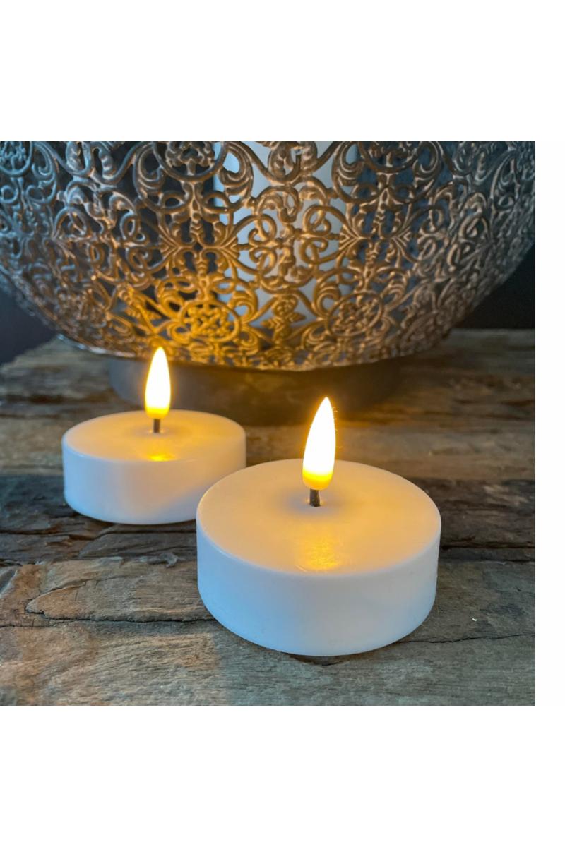 2 pakning med store telys som kommer med et tynt lag av voks med en flamme som blafrer.